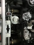 Now, locate the sender at the front of the oil tank. You can see the top of it here with the circular ridge. It is held in place with 2 t30 screws. I was able to remove them using the t30 socket and ratchet. The sender can be dislodged at this point, but you will notice the transmission mount is preventing it from being fully removed. The oil level should be below the hole for the sender, but just in case, it probably a good idea to wedge a rag below the sender in case any oil does dribble out.