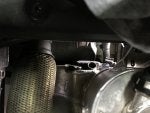 Next, you need to remove the head shield between the oil tank the the exhaust. There is on t30 screw into the oil tank, and 2 underneath the exhaust flex joint. Since you can't see the ones under the exhaust, they aren't necessarily easy to remove. I used a t30 socket and 1/4 ratchet on the rear most screw (operated the ratchet below the flex joint) and the same setup with a wobble extension on the forward bolt (operated the ratchet above the flex joint). There are also flat washers that may or may not stick to the heat shield, so be careful not to lose them when removed the screw.